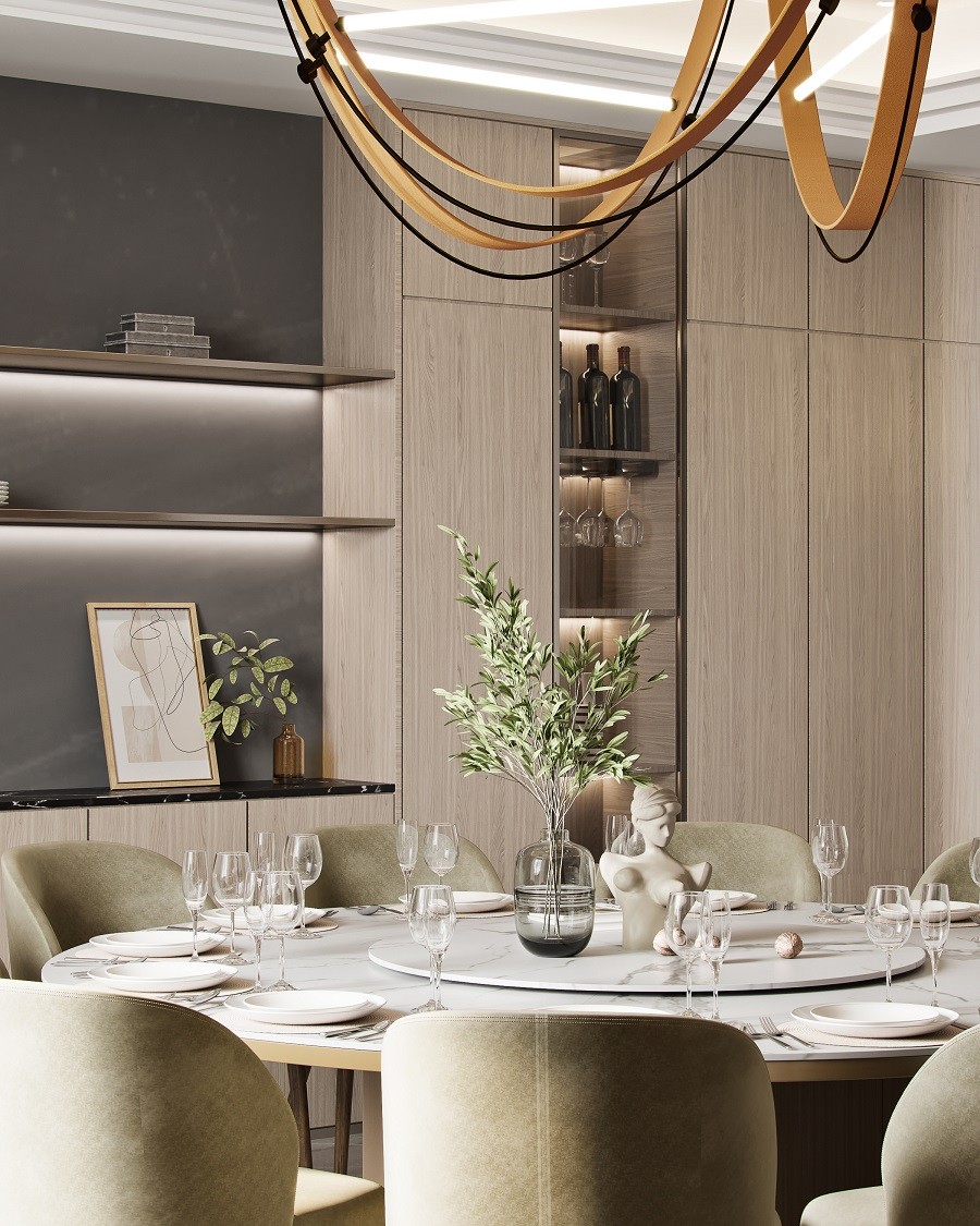 餐廳材質(zhì)講究的餐桌上擺放精致的餐具和花瓶,嫩綠色的餐椅給人一種清新的感覺(jué),餐邊柜里擺放著畫(huà)作和美酒。