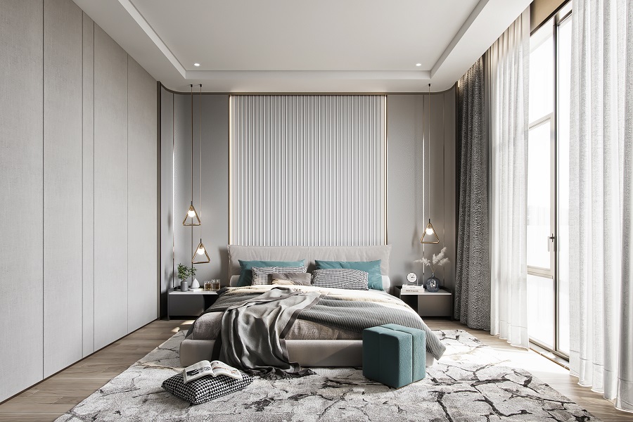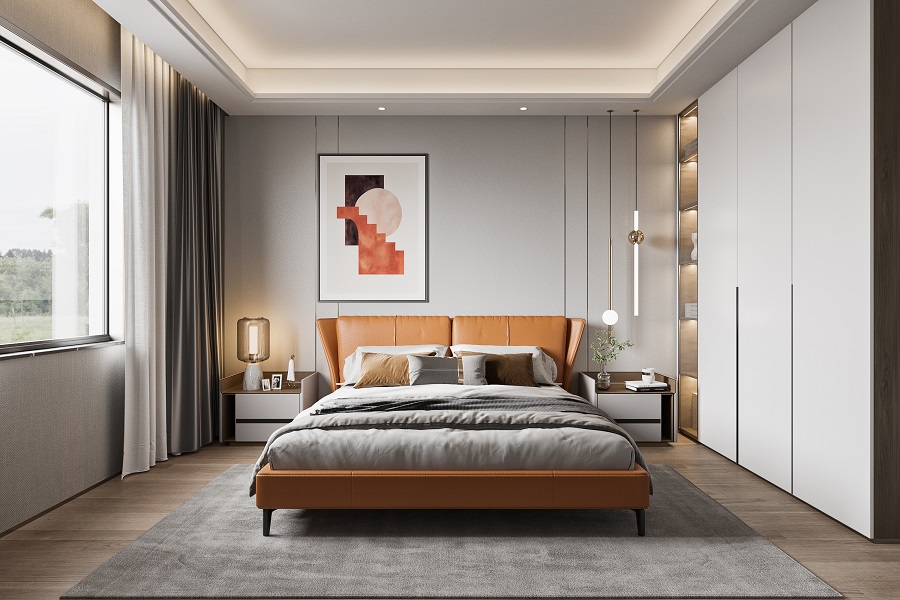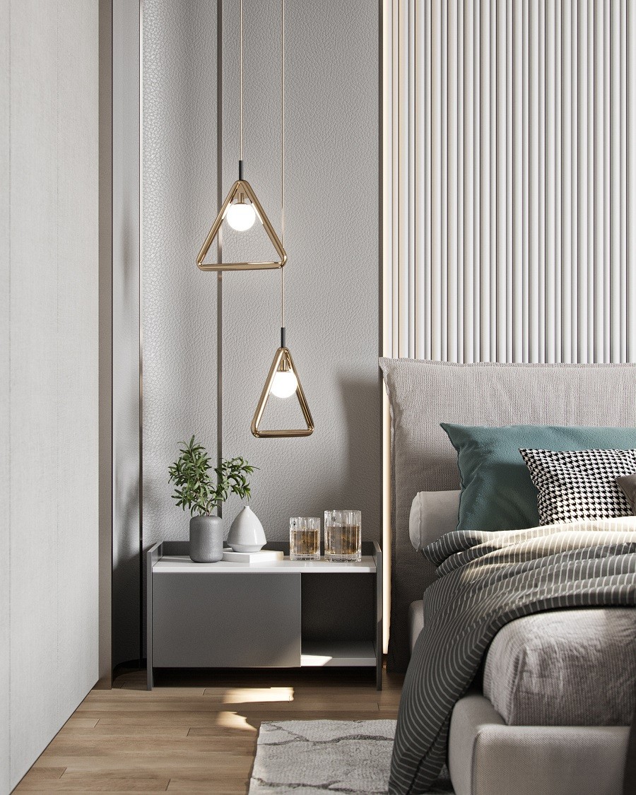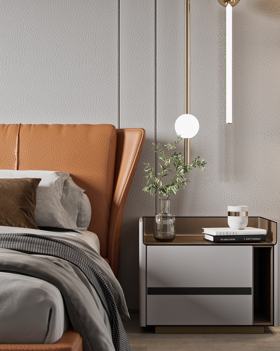 主臥灰色床頭背景墻上掛著一幅抽象的畫(huà)作,增添了房間的藝術(shù)氣息,設(shè)計(jì)巧妙的垂線(xiàn)吊燈懸掛在床邊。