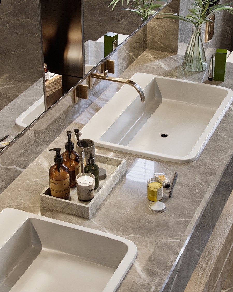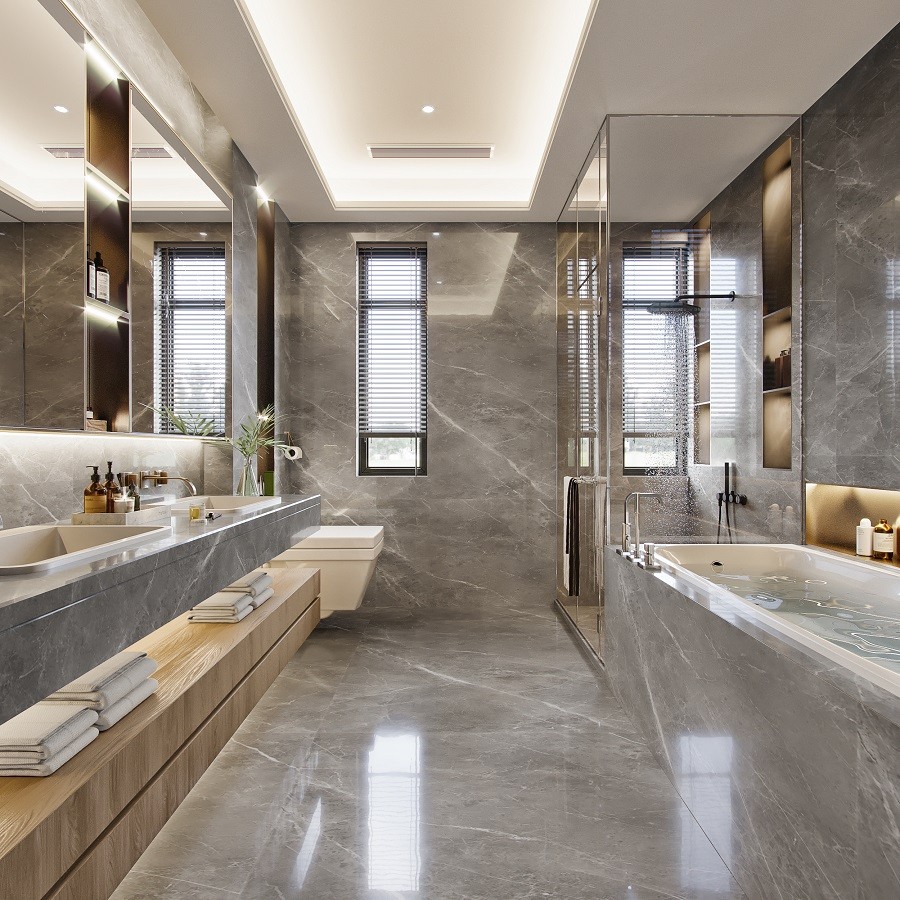 衛(wèi)生間以灰色為主色調(diào),浴缸靠墻設(shè)計(jì),充分利用墻面空間。