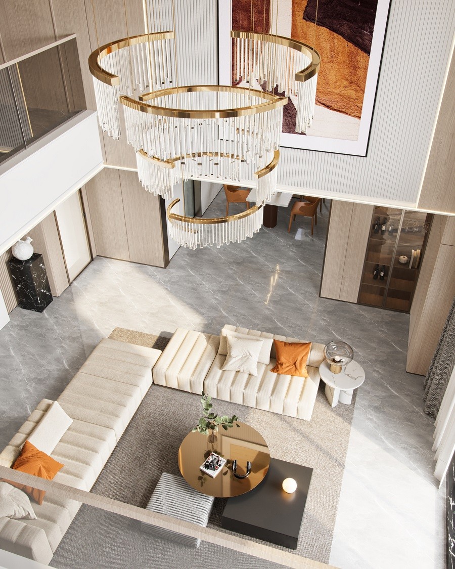 客廳采用挑空設(shè)計(jì),造型優(yōu)雅的沙發(fā)搭配灰色的地毯,暗金色的圓形茶幾上擺放著書(shū)和花瓶,設(shè)計(jì)精美的水晶吊燈垂吊而下,室外的陽(yáng)光在空間里留下明亮的光影。